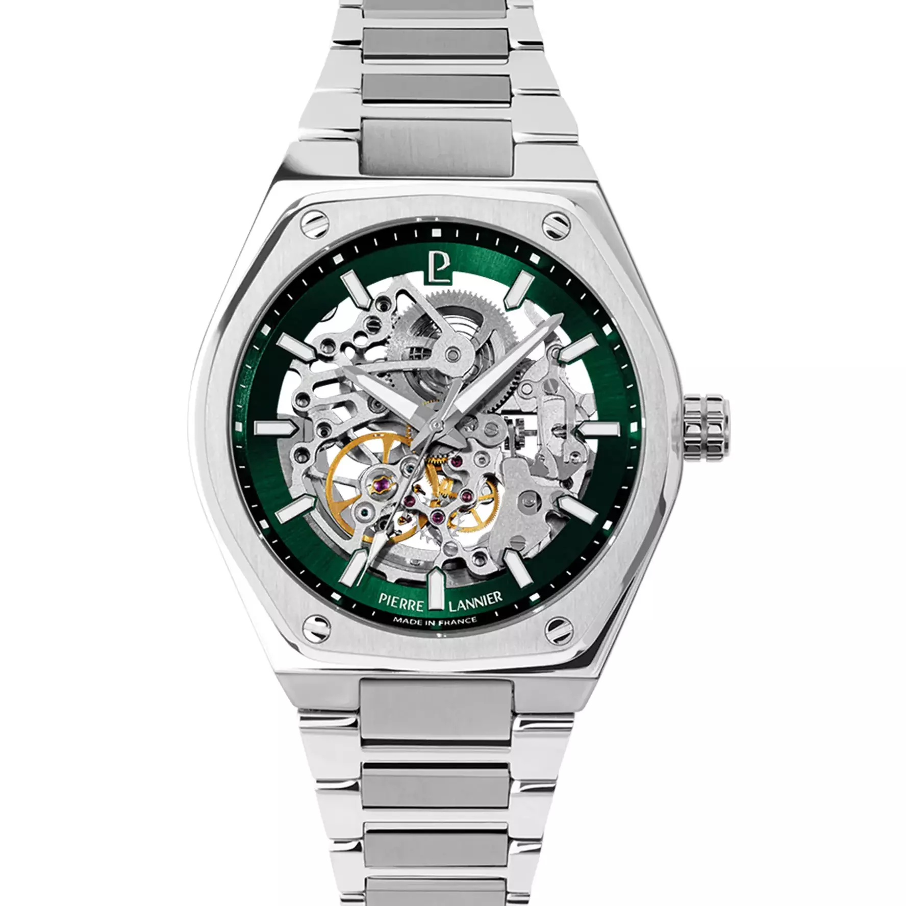Son cadran vert soleillé squelette dévoile le mouvement automatique dans toute sa précision, enrichi d’index luminescents pour une lisibilité optimale. Le boîtier tonneau en acier brossé renforce son style industriel et original.
